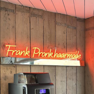 Onze neon van Neonsfeer geeft direct karakter Frank Pronk haarmode” springt eruit op de houten wand. Sfeervol, stijlvol en helemaal ons! De neon van Neonsfeer is een echte sfeermaker