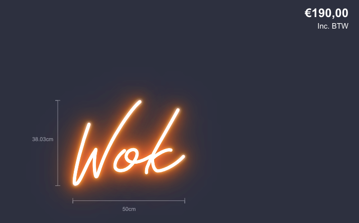 In je offerte ontvang je deze minimale afmeting, samen met meerdere grotere opties, zodat je kunt kiezen wat het beste bij jouw wensen past. Voor grotere ontwerpen (meer dan 100 cm lang of 50 cm hoog) kunnen we het neon in twee delen leveren, wat het transport en de montage vergemakkelijkt.